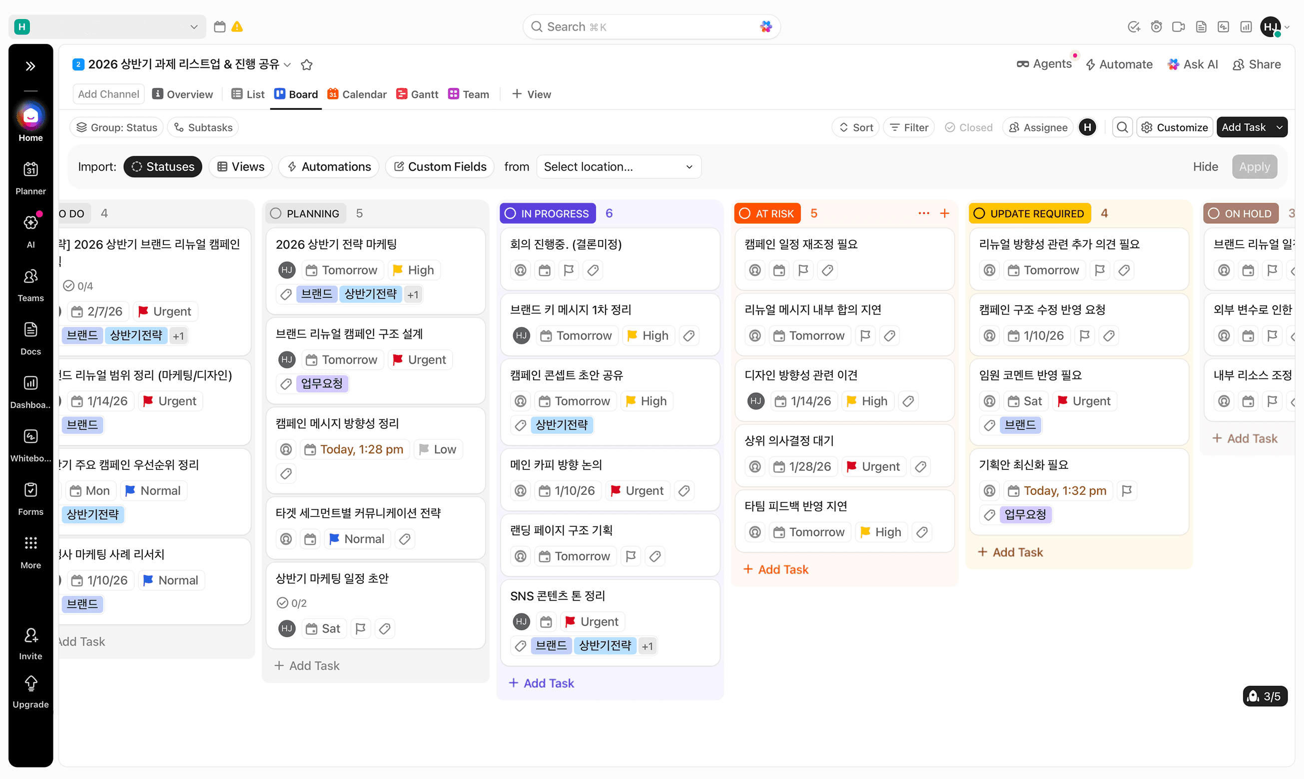 ClickUp์์๋ ํ๋ก์ ํธ ๊ตฌ์กฐ, ์ํ๊ฐ, ํ๋, ์๋ํ๊น์ง ๊ฑฐ์ ๋ชจ๋ ๊ฒ์ ํ์ด ์ง์ ์ค๊ณํ ์ ์์ต๋๋ค.