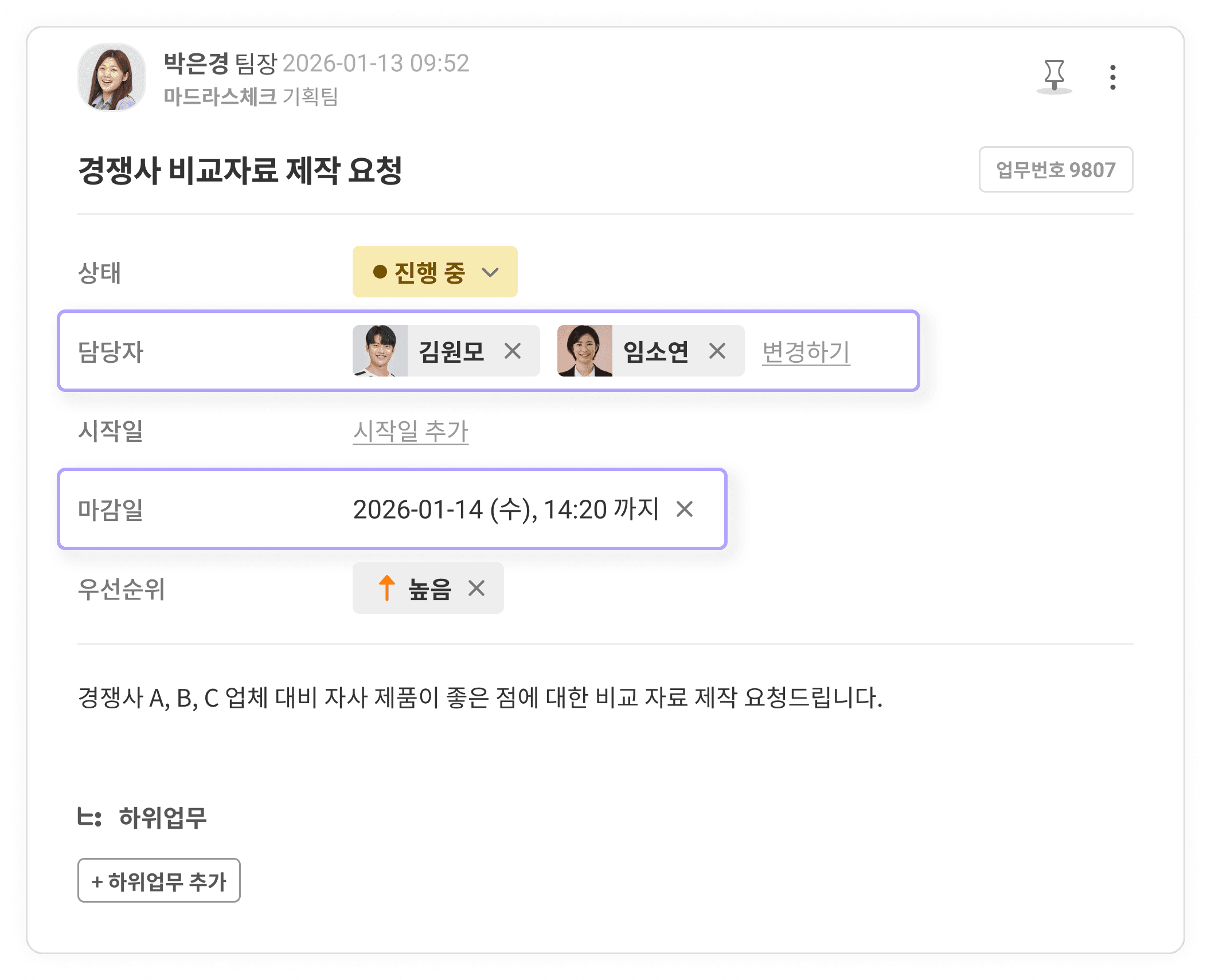 ๋ด๋น์๊ฐ ์ง์ ๋๋ฉด ๋๊ฐ ์ด ์ ๋ฌด๋ฅผ ์ฑ ์์ง๋์ง๊ฐ ๋ถ๋ช ํด์ง๊ณ , ๋ง๊ฐ์ผ์ด ์ ๋ ฅ๋๋ฉด ์ธ์ ๊น์ง ํด์ผ ํ๋์ง๋ ๋ช ํํ๊ฒ ์ ๋ฆฌ๋ฉ๋๋ค. ์ด ์์ ๋ถํฐ ์ ๋ฌด๋ ๋จ์ํ ๋ฉ๋ชจ๊ฐ ์๋๋ผ, ์ผ์ ๊ด๋ฆฌ์ ๋์์ด ๋ฉ๋๋ค.