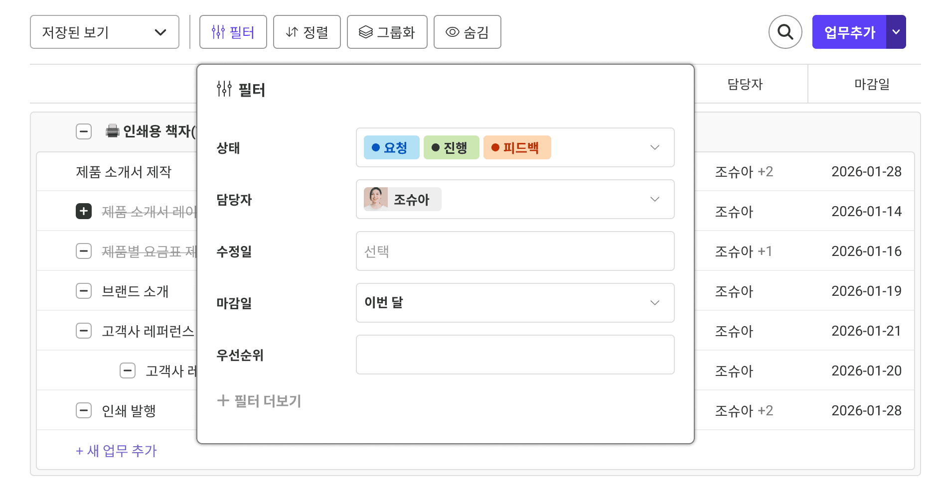 ์๋ฅผ ๋ค์ด ์ด๋ฒ ์ฃผ ์์ ๋ด๊ฐ ๋ง๋ฌด๋ฆฌํด์ผ ํ ์ ๋ฌด๋ง ์ ๋ฆฌํ๊ณ ์ถ๋ค๋ฉด, ์ ๋ฌด ํํฐ์์ ๋ด๋น์๋ฅผ '๋', ๋ง๊ฐ์ผ์ '์ด๋ฒ ์ฃผ'๋ก ์ค์ ํด ํด๋น ์ ๋ฌด๋ง ๋ชจ์์ ํ์ธํ ์ ์์ต๋๋ค. ์ฌ๊ธฐ์ ์ฐ์ ์์๋ฅผ ํจ๊ป ์ค์ ํ๋ฉด, ๊ฐ์ ๊ธฐ๊ฐ ์์์๋ ๋จผ์ ์ฒ๋ฆฌํด์ผ ํ ์ ๋ฌด๋ฅผ ๊ธฐ์ค์ผ๋ก ์ ๋ฆฌํ ์ ์์ด ์ ๋ฌด ์์๋ฅผ ์ก๋ ๋ฐ ๋์์ด ๋ฉ๋๋ค. ์ด๋ ๊ฒ ํํฐ๋ฅผ ํ์ฉํ๋ฉด ์ฌ๋ฌ ์ ๋ฌด๋ฅผ ํ๋์ฉ ํ์ธํ์ง ์์๋, ์ง๊ธ ์ง์คํด์ผ ํ ์ผ๋ง ๋น ๋ฅด๊ฒ ํ์ ํ ์ ์์ต๋๋ค.