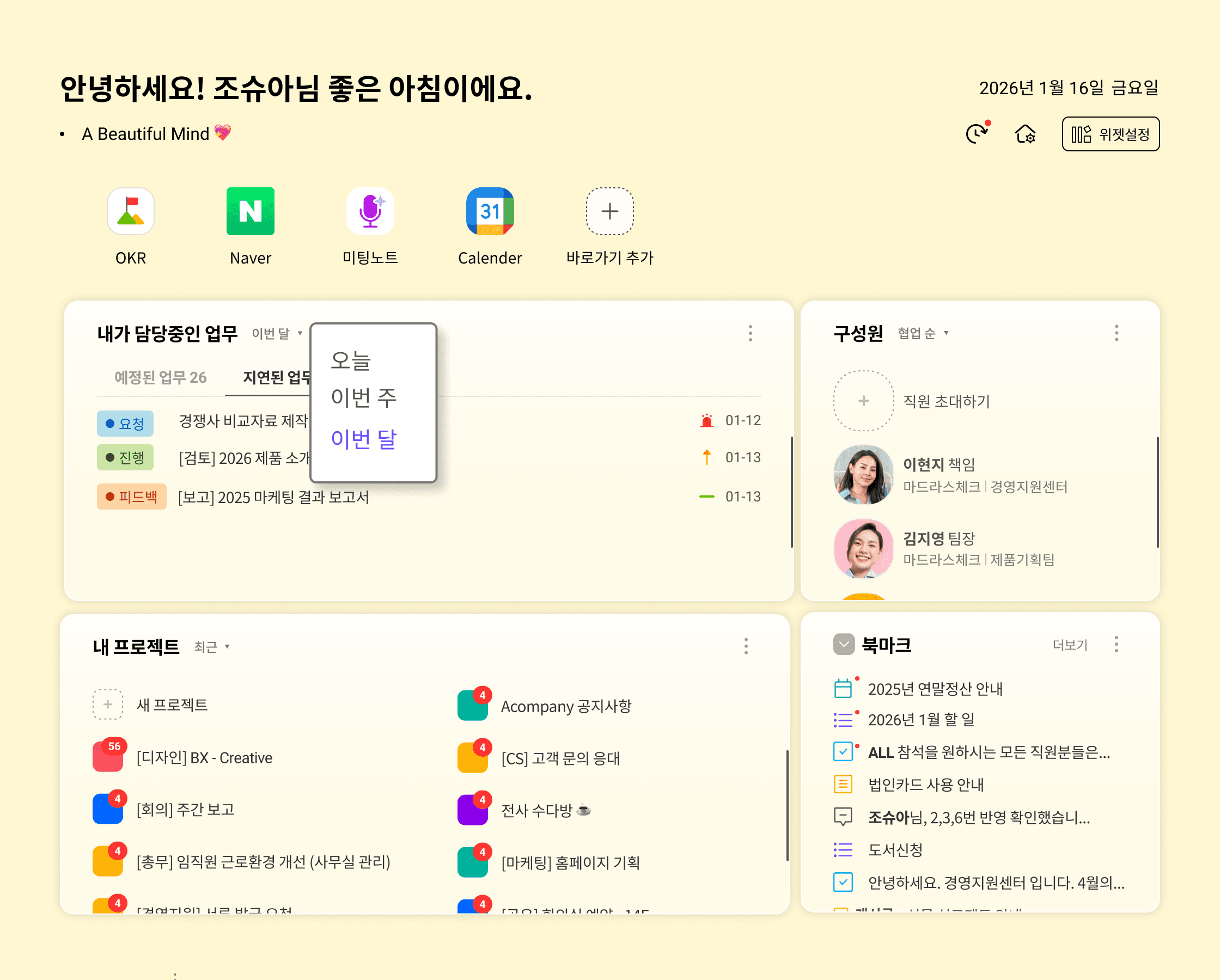 ๋ด๋น์์ ๋ง๊ฐ์ผ์ด ์ ๋ ฅ๋ ์ ๋ฌด๋ ํ๋ก์ฐ๋ฅผ ์ผ๋ ์๊ฐ๋ถํฐ ์ฐจ์ด๊ฐ ๋๊ปด์ง๋๋ค. ์ถ๊ทผํด์ ํ๋ก์ฐ๋ฅผ ์ฒ์ ์ด๋ฉด ๊ฐ์ฅ ๋จผ์ ๋ณด์ด๋ ํ๋ฉด์ด ๋์๋ณด๋์ธ๋ฐ, ์ด ํ๋ฉด์์ ์ค๋ ํด์ผ ํ ์ ๋ฌด์ ์ด๋ฒ ์ฃผ, ์ด๋ฒ ๋ฌ ์์ ์ฑ๊ฒจ์ผ ํ ์ ๋ฌด๊ฐ ๋ง๊ฐ์ผ ๊ธฐ์ค์ผ๋ก ์ ๋ฆฌ๋์ด ๋ณด์ ๋๋ค.